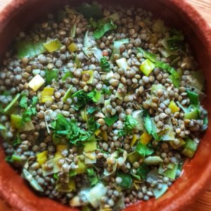 Aliter lenticulam: coquis. cum despumaverit, porrum et coriandrum viridem supermittis. ‹teres› coriandri semen, puleium, laseris radicem, [semen] mentam et rutam, suffundis acetum, adicies melle, liquamine, aceto, defrito temperabis, adicies oleum, agitabis. Si quid opus fuerit, mittis. Amulo obligas, insuper oleum viridem mittis, piper aspargis et inferes.