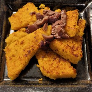 Connue à Gênes sous le nom de farinata, cette galette salée très fine est préparée avec des ingrédients simples: farine de pois chiches, eau, sel, huile d’olive, graines… Son origine remonte à l’Antiquité. A l’époque les soldats grecs et romains préparaient ce mélange en le cuisant sur des pierres chaudes ou sur leurs boucliers afin de se nourrir rapidement sans trop dépenser.