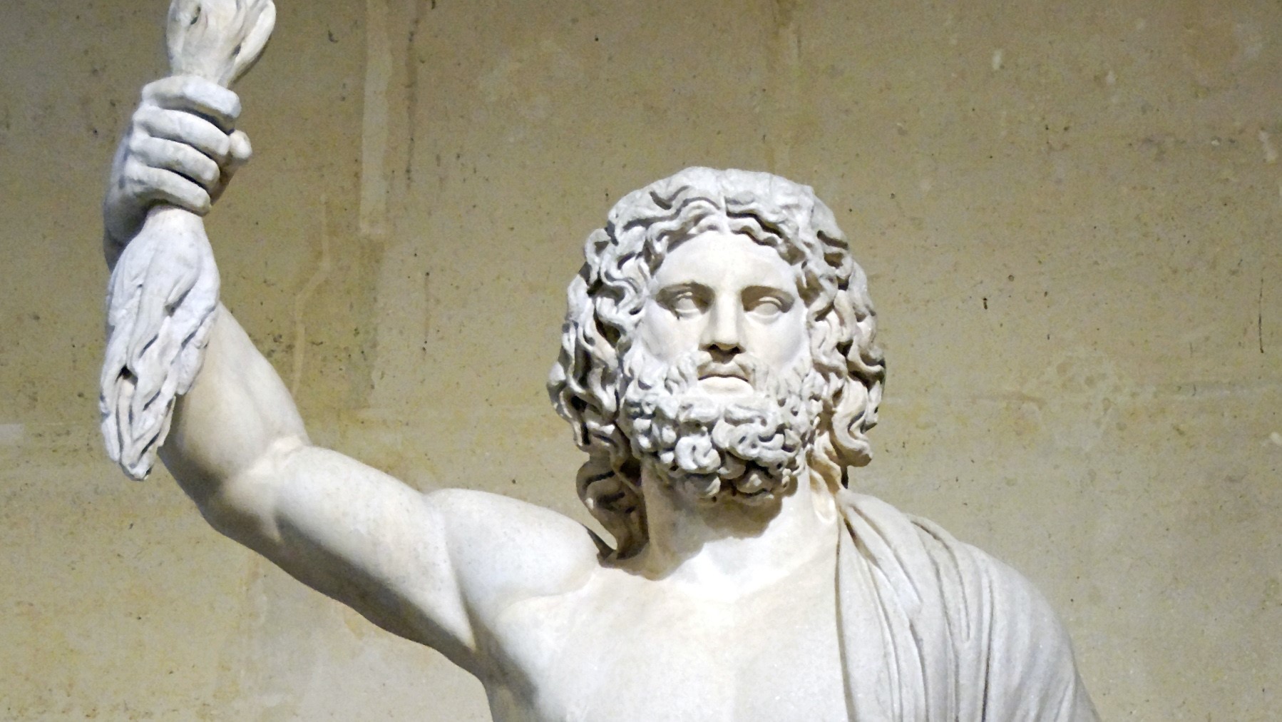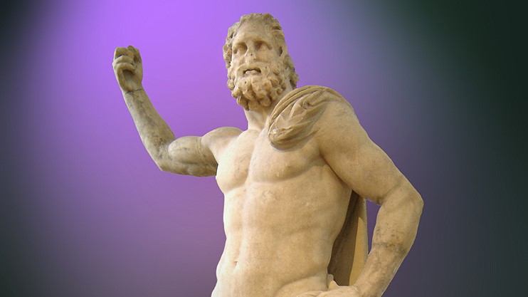 Depuis qu’il a évincé les Titans et les Géants, Zeus (Jupiter pour les Romains) règne en maître absolu sur les divinités et les humains. Dans le partage de l’univers avec ses frères, il s’est gardé le ciel, ce qui est quand même mieux que la mer (Poséidon) et surtout que le monde souterrain (Hadès). De là, il peut foudroyer tous les récalcitrant-e-s, et poursuivre de ses assiduités femmes divines et mortelles. Sa puissance lui permet aussi, quand il le veut bien, d’être justicier et protecteur, voir bienfaiteur et sauveur. Ses attributs sont la foudre (soit un faisceau d’éclairs), l’aigle, le chêne, et sa couleur le blanc.
