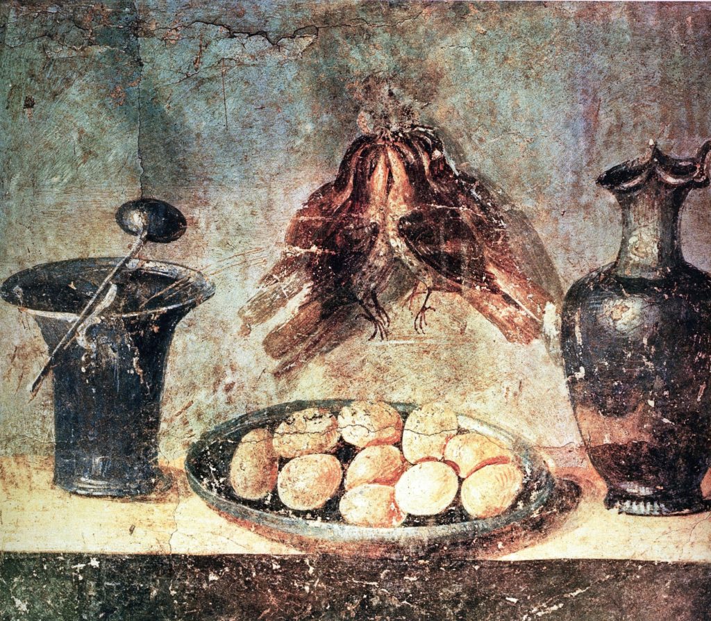 A dish of eggs represented on a fresco of the house of Julia Felix in Pompeii.