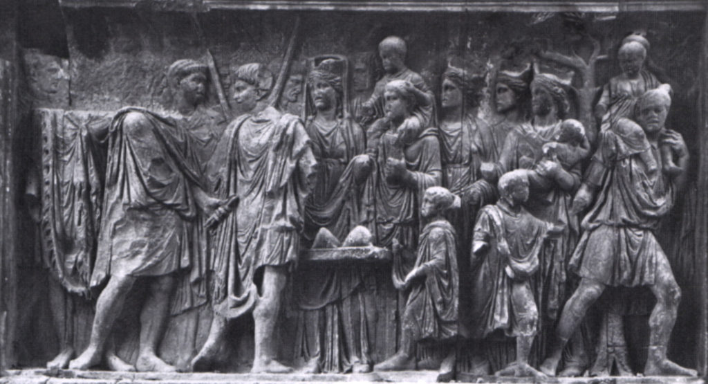 Il primo è un bassorilievo su un arco trionfale dedicato a Traiano e situato nella città campana di Benevento. Mostra dei padri che portano i loro figli a un curatore che distribuisce cibo.