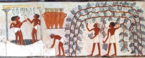 Dès le 3e millénaire avant notre ère, les Egyptiens sont les premiers à représenter le procédé de vinification sur des bas-reliefs montrant des scènes de vendange, de foulage et de pressurage. Dans l’Egypte pharaonique, le vin –irep– est un produit d’exception, réservé aux élites. Mais, dès le Nouvel Empire (-1550 à -1085), les textes mentionnent une boisson encore plus rare et prestigieuse que le vin, le shedeh. Il s’agirait ni plus ni moins que du cadeau du dieu soleil Râ à ses fils.